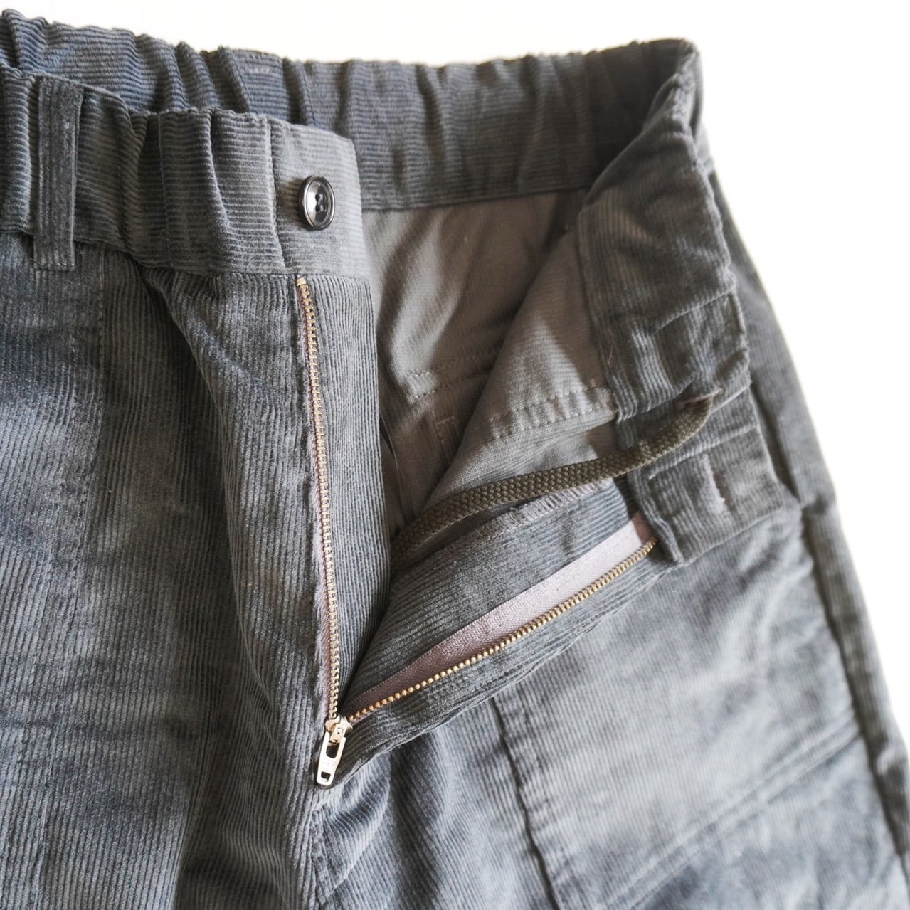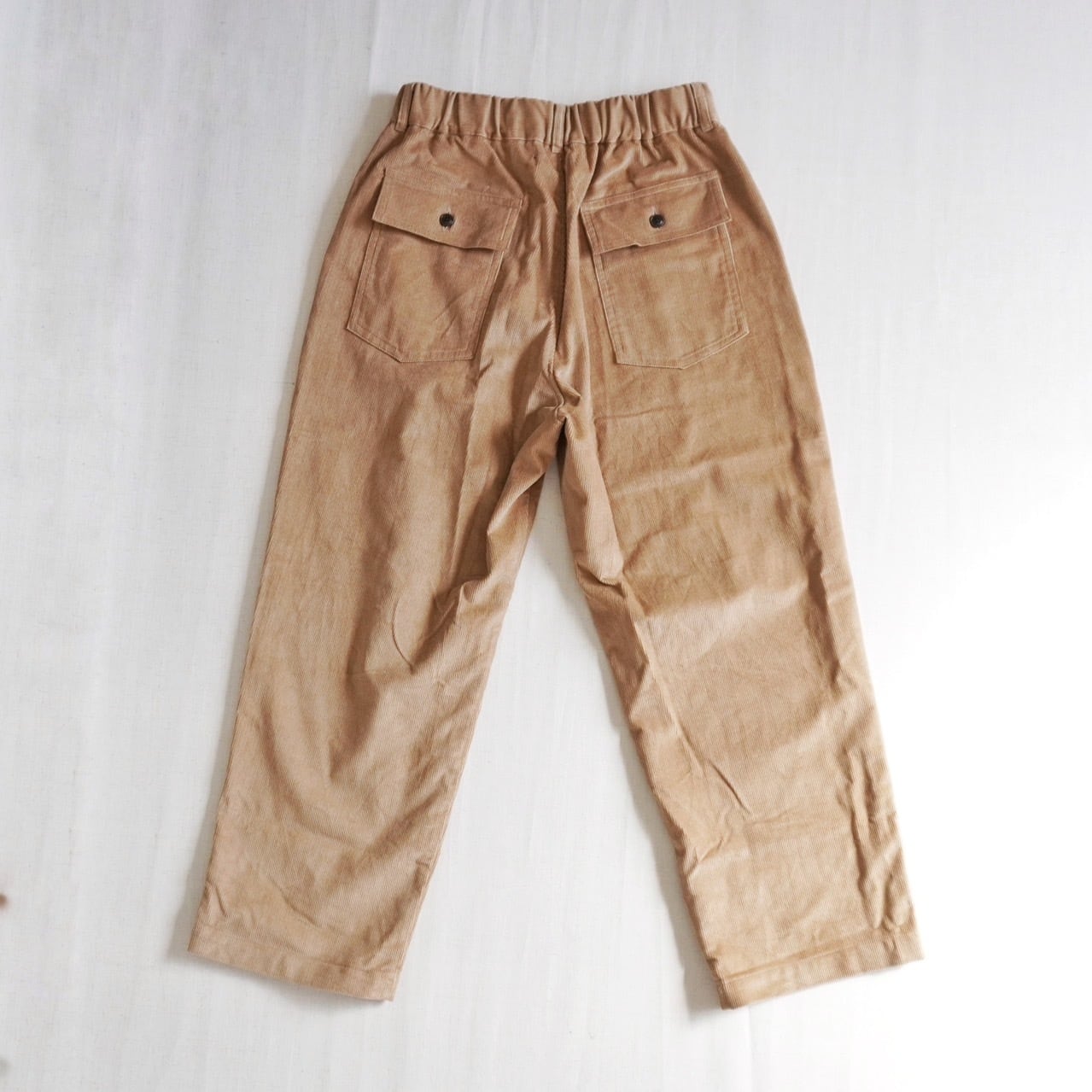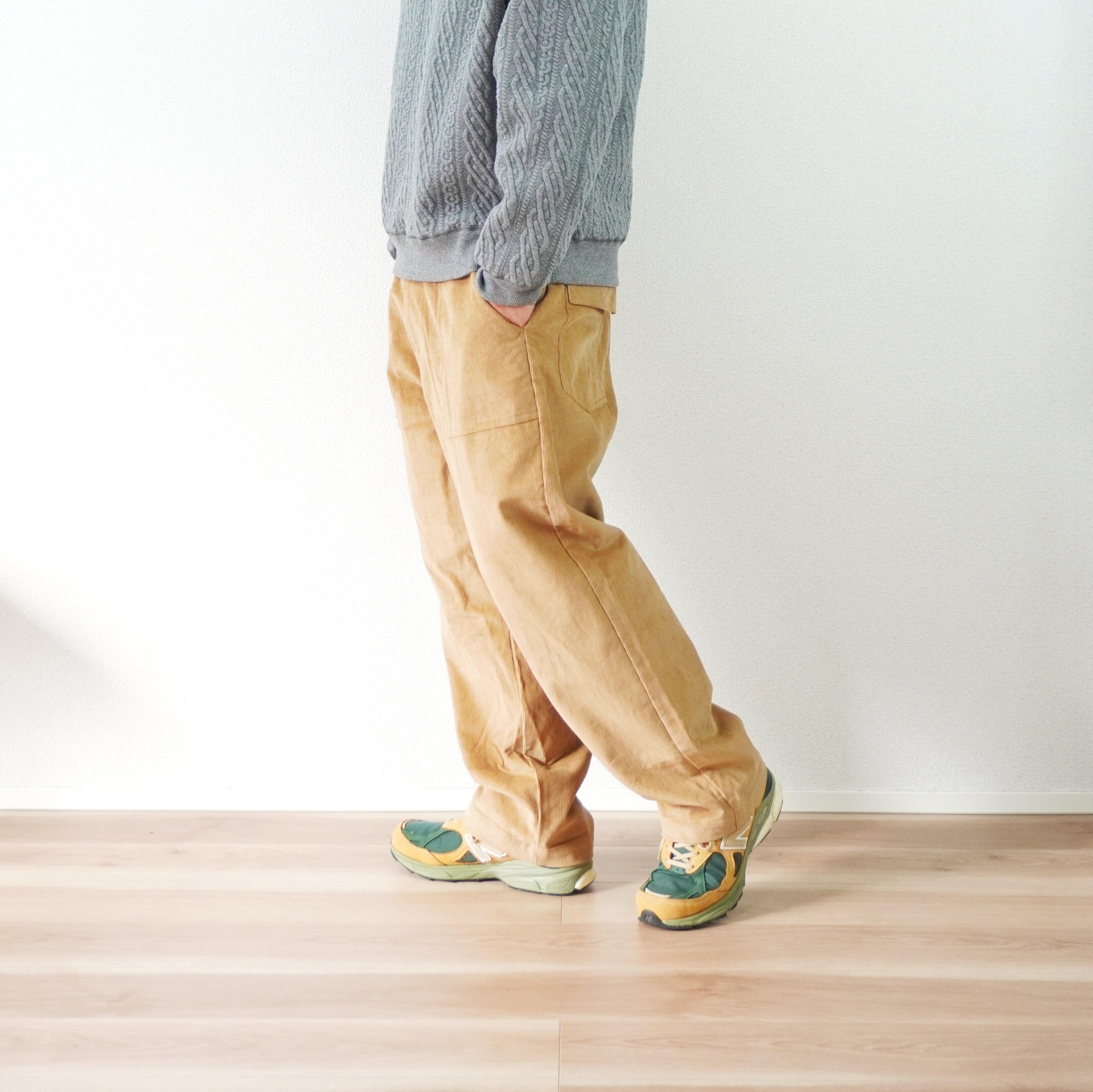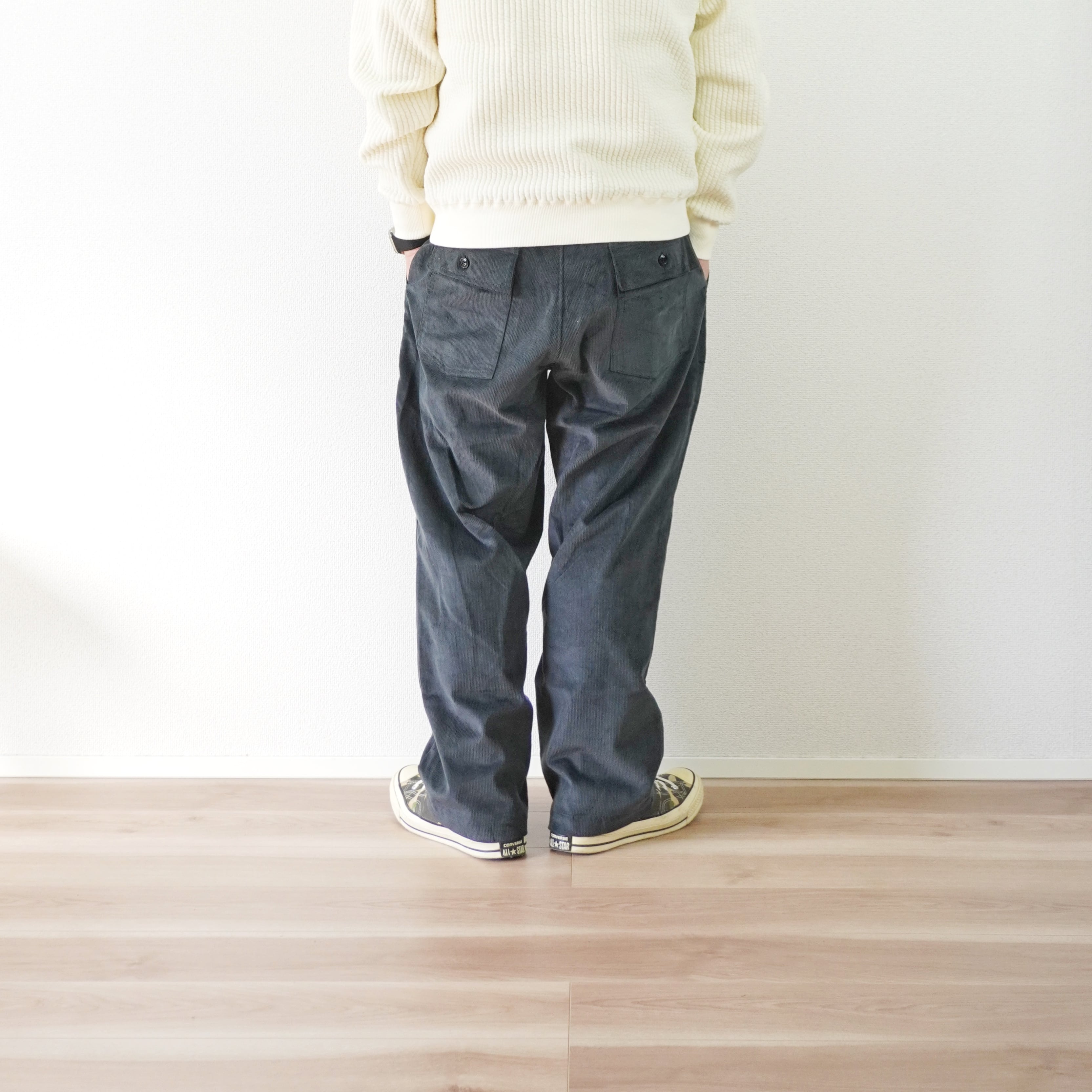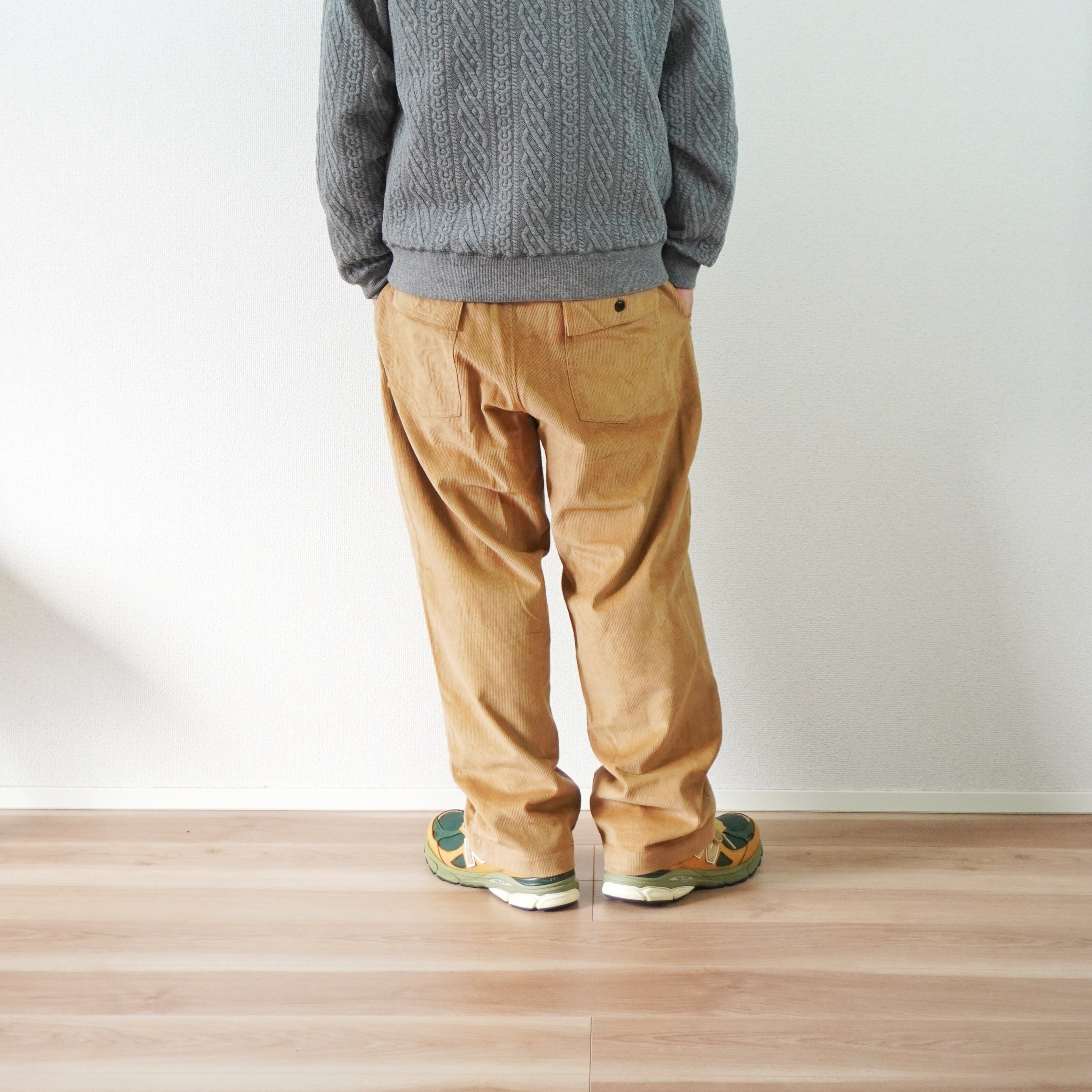 イージーパンツの気軽さに、尾州産コーデュロイの上品さが見事に融合しています。